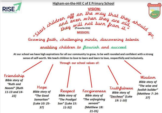 Higham on the Hill C of E Primary School encourages and promotes Christian Values. We actively live out our values during our school day and beyond and reflect on all of the values we uphold across the year.